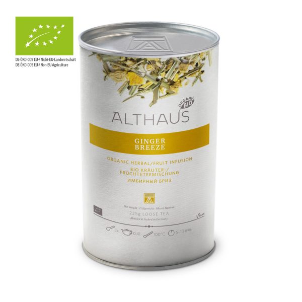 The herbal infusion Ginger Breeze combines aromatic ginger and spicy notes of black pepper with the citric freshness of lemongrass and orange peels.
